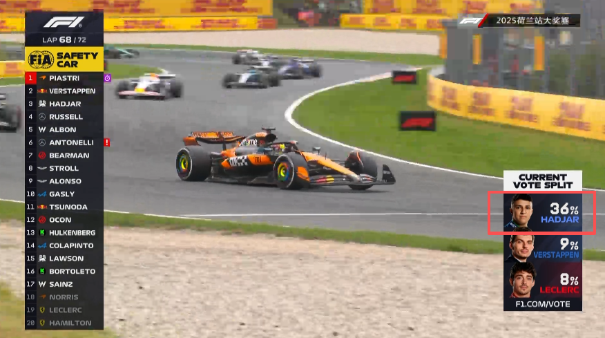而随着诺里斯的退赛,哈贾尔升至第三名!若是以这个排名结束比赛,这个曾在围场内流下眼泪的新秀将在自己的新秀赛季就登上领奖台!而维斯塔潘则在主场车迷的见证下,继续提升自己的排名!